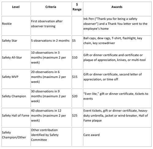 Individual recognition is critically important to sustain BBS efforts. Generally the Safety Committee should create an individual recognition plan to support participation in observations, quality observations, and other individual contributions to safety. The table below provides an example of an individual recognition plan that might be used to support the process. The idea is that while the plan provides a basic set of criteria and guidelines for individual recognition, the Committee has the flexibility to provide different forms of recognition (at roughly the same value), or even identify contributions other than those identified in the initial plan, that may be more meaningful to the recognized individual.
