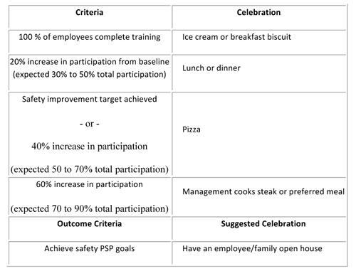 The criteria for team celebrations typically target improvements in team participation or focus on achieving safety improvement goals based on observation data. They almost always involve some kind of food or beverage. They are best planned for small groups or crews of 15 employees although logistical considerations often dictate the size of groups. Often, groups that meet together for safety meetings are appropriate. However, an organization that holds really large safety meetings should consider restructuring the groups because smaller meetings are more effective for both safety communication and celebrations. This table presents a sample team recognition plan.